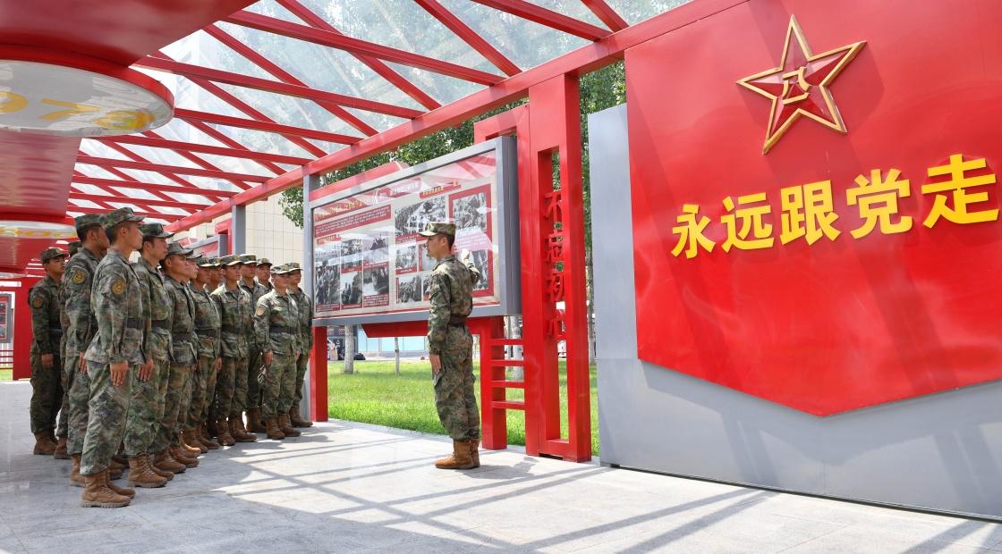 7月20日,中部战区陆军第81集团军某旅“松骨峰特功连”组织官兵在所在旅队军史长廊参观学习。新华社发(何鹏刚 摄)