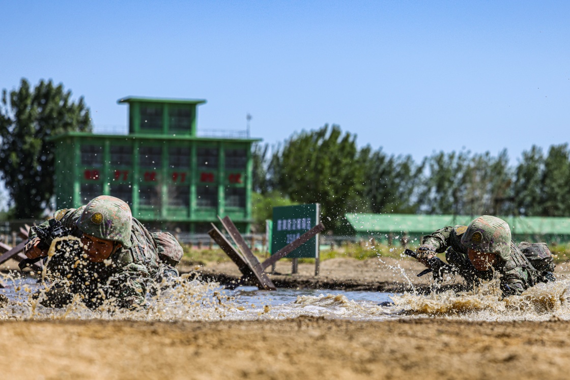 中部战区陆军第81集团军某旅“松骨峰特功连”进行单兵战术综合演练,官兵们快速通过涉水场(2023年6月9日摄)。新华社发(姜慧鑫 摄)