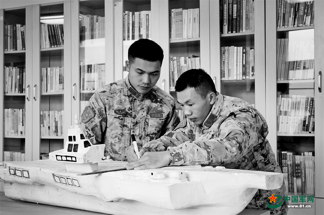 二级上士黄勇(右)和战友在制作木雕。穆林 摄