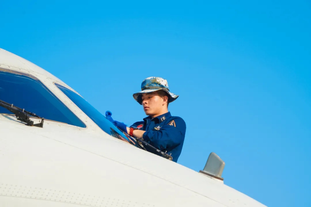 ▲飞行前,地勤官兵仔细擦拭机窗玻璃