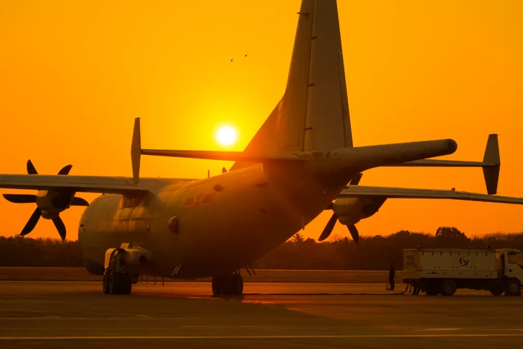 ▲金黄色的落日余晖下,战机即将出击