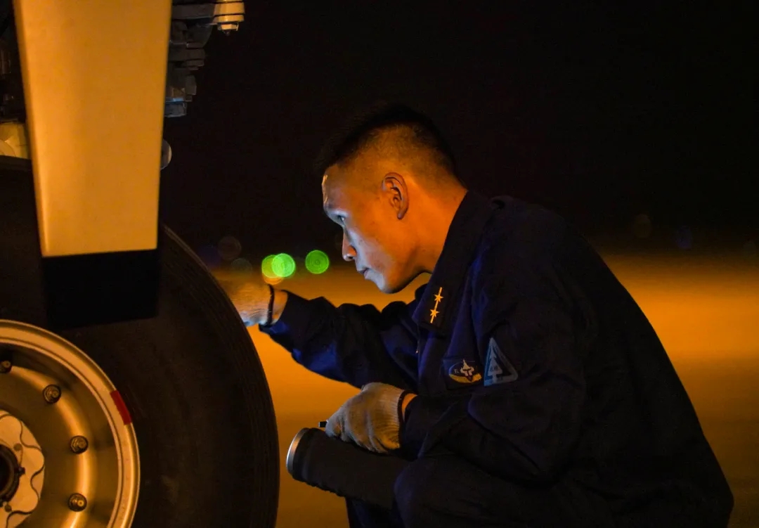 ▲飞行结束,地勤官兵细致维护战机轮毂
