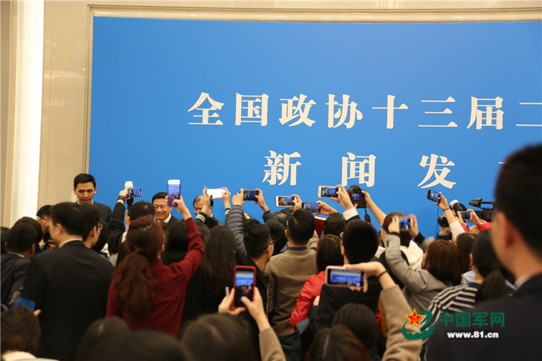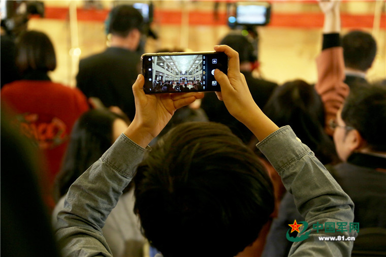 3月2日下午,全国政协十三届二次会议新闻发布会在北京人民大会堂举行。这是新闻发布会结束后记者拿出手机拍摄发言人近照。中国军网记者 孙智英 摄