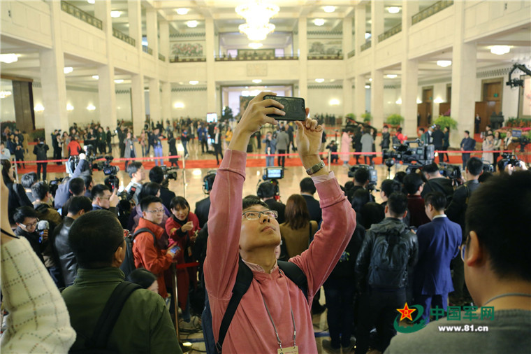 全国政协十三届二次会议首场“委员通道”3月3日下午在人民大会堂北大厅举行。这是记者在现场使用手机拍摄报道。中国军网记者 孙智英 摄