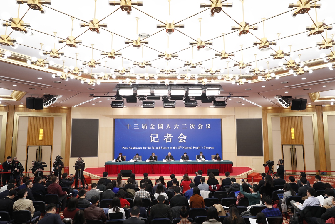 3月11日,十三届全国人大二次会议新闻中心举行记者会,邀请科技部部长王志刚、副部长李萌、战略规划司司长许倞、政策法规与创新体系建设司司长贺德方、资源配置与管理司司长张晓原就“加快建设创新型国家”相关问题回答中外记者提问。新华社记者 沈伯韩 摄