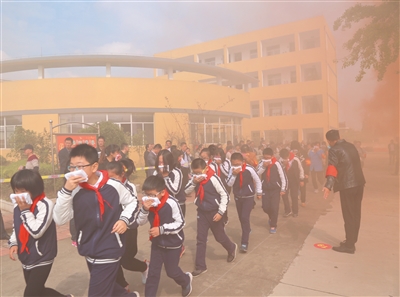 10月16日,我市创建“国家级学校安全教育示范区”现场推进会在墩头中心小学召开。与会人员参观了墩头中心小学创建“国家级学校安全教育示范区”的台账资料,观摩了6节安全示范课和该校消防应急疏散演练。图为消防演练现场。(周强 韩雪鹏 摄)