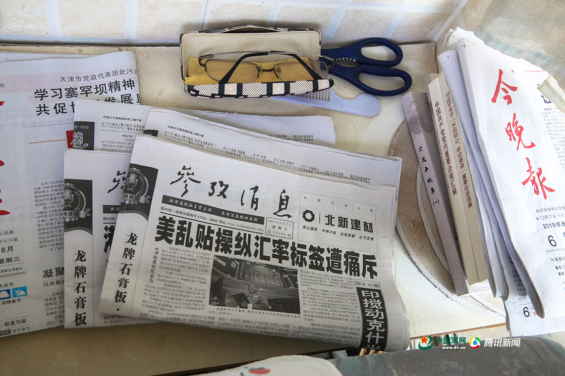 99岁的苏征南虽然身患糖尿病、冠心病、高血压,但是耳不聋、眼不花,每天仍然坚持看报看书学习,在他经常坐的沙发一侧的小桌子上摆放着《参考消息》《今晚报》等报纸。中国军网记者 孙智英 摄