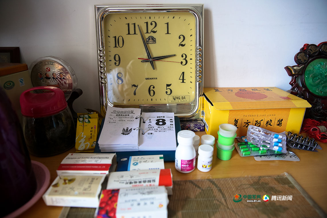 卧室的桌子上摆放着苏征南经常吃的药物,虽然现年99岁的苏征南耳不聋、眼不花,但是他身患糖尿病、冠心病、高血压,需要按时吃药。中国军网记者 孙智英 摄