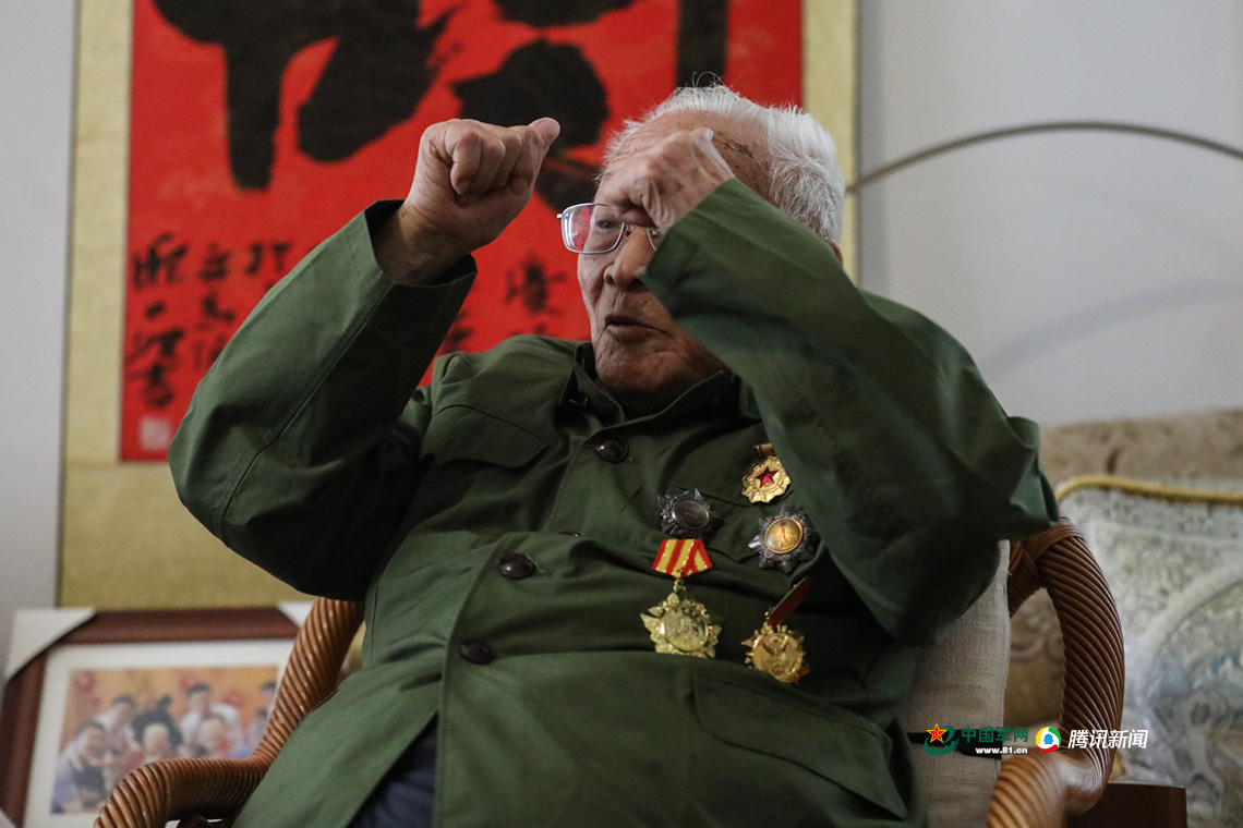 薛中天讲述上党战役中头部负伤时的情景。中国军网记者 伍行健 摄