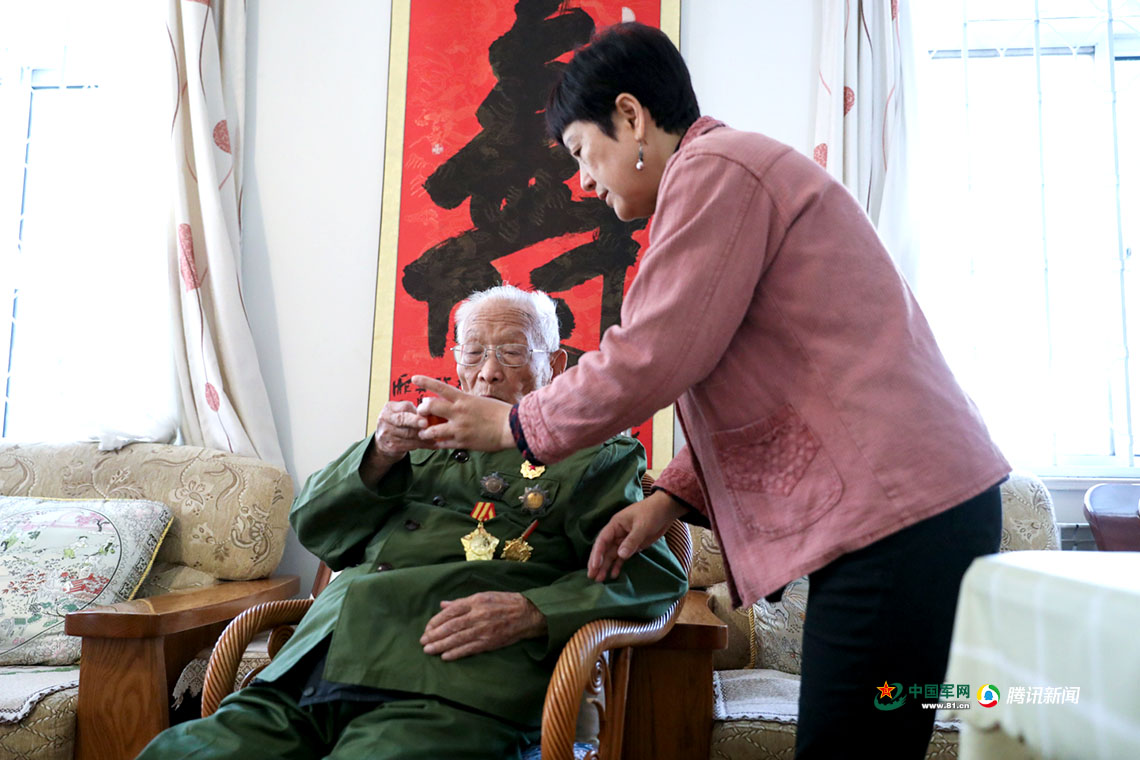采访间隙,薛中天的女儿端水给他喝。中国军网记者 伍行健 摄