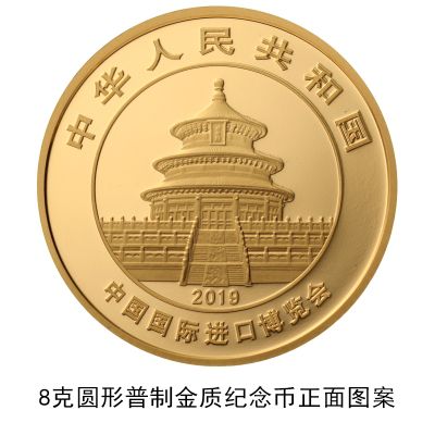 8克圆形金质纪念币背面图案为母子熊猫图,并刊“8g Au.999”字样、“中国国际进口博览会”英文字样及面额。30克圆形银质纪念币背面图案为母子熊猫图,并刊“30g Ag.999”字样、“中国国际进口博览会”英文字样及面额。