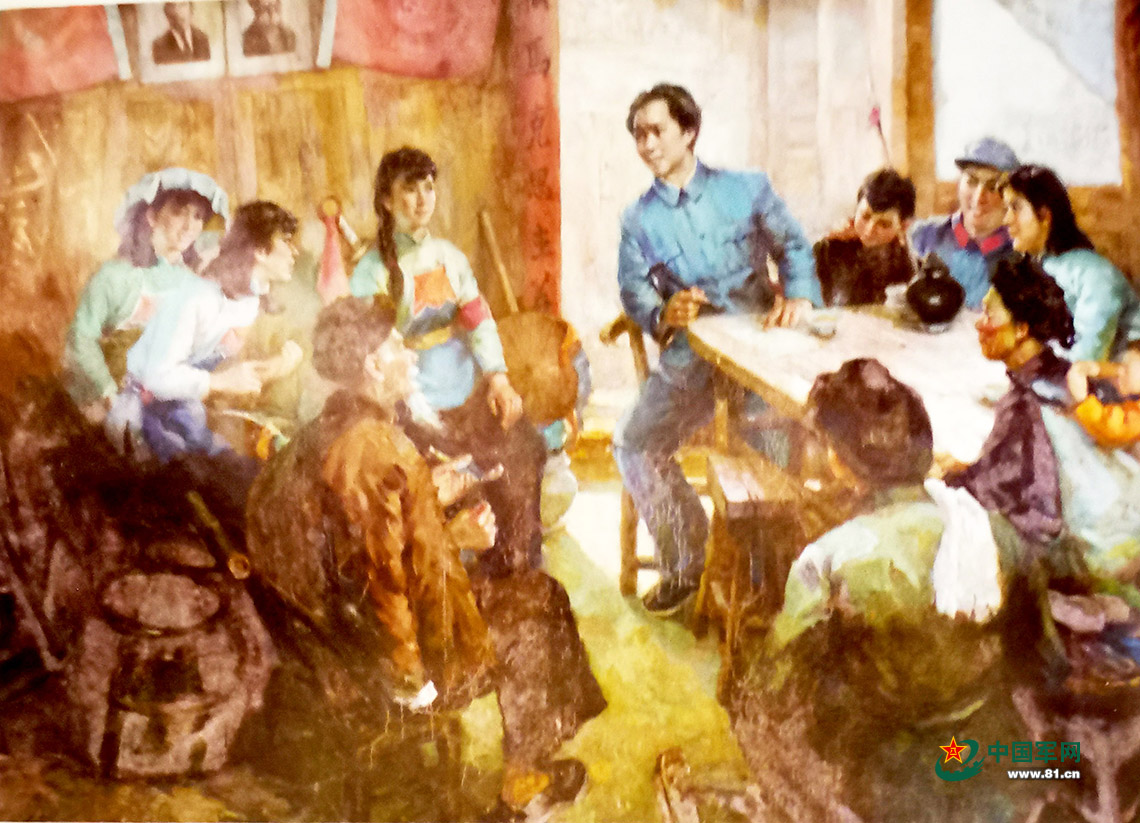 从上面这幅油画中可以看到当时毛泽东在才溪乡调查的一些情形。油画中,一群人坐着大小不一、形式各样的凳子,围着毛泽东坐成一圈,其中有老人、妇女、儿童,也有红军战士和青壮年,毛泽东一手拿笔,一手按着纸张,边倾听群众的发言边记录下来。