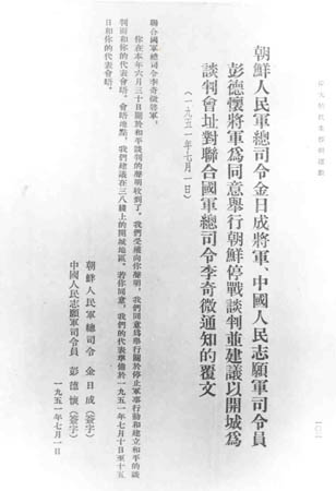 7月1日,金日成、彭德怀答复李奇微,同意举行谈判,建议以“三八线”上的开城为停战谈判会址。