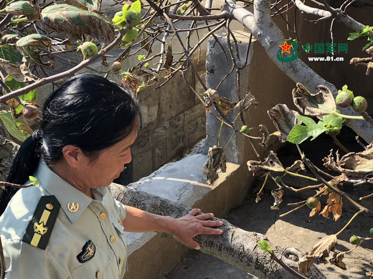 王仕花抚摸着当年夫妻俩在树干上刻下的字迹。中国军网记者牛晨斐摄
