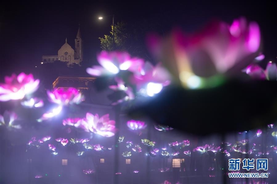 12月1日晚,一年一度的“2019澳门光影节”在南湾湖畔开幕,活动内容包括光雕表演、灯饰装置和互动游戏等,让市民和游客感受澳门即将迎来回归祖国20周年的喜庆氛围。 新华社记者 张金加 摄