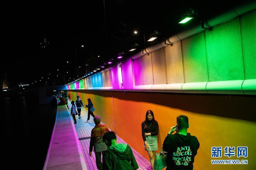 12月1日,市民在南湾湖畔的光影节上游览。 当晚,一年一度的“2019澳门光影节”在南湾湖畔开幕,活动内容包括光雕表演、灯饰装置和互动游戏等,让市民和游客感受澳门即将迎来回归祖国20周年的喜庆氛围。 新华社记者 张金加 摄