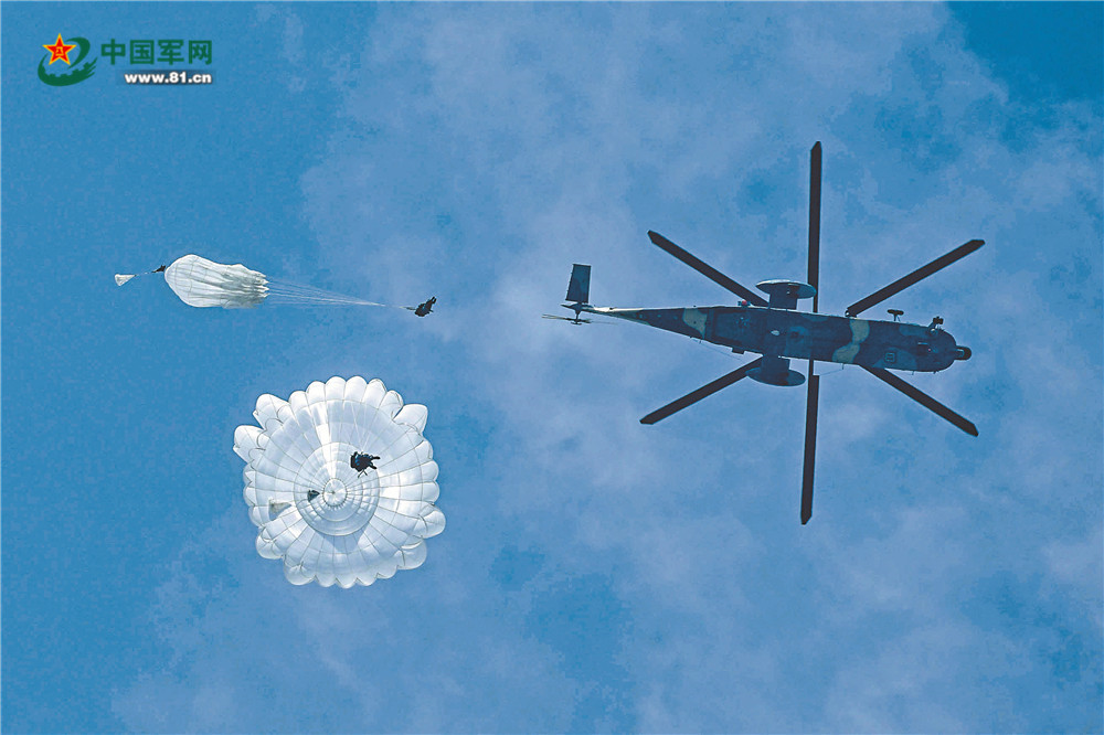 这是空降兵某部侦察分队进行的一场实战化训练。当天上午9时许,满载突击队员的直升机飞抵预定空域后,突击队员从尾门鱼贯而出,一朵朵伞花绽放蓝天。