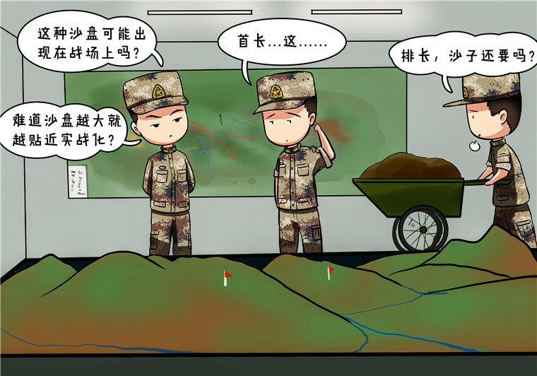 “沙盘堆得不错,当作展览品都可以拿奖了。”不知何时,旅里王副参谋长出现在了他们身旁,望着沙盘若有所思。“这种沙盘可能出现在战场上吗?‘2×3’米就足够了,现在放大数倍,时间都耗在了‘虚功’上。”本来是检查议训研战情况,却发现沙盘还在堆制过程中,王副参谋长不留情面地提出了质疑。