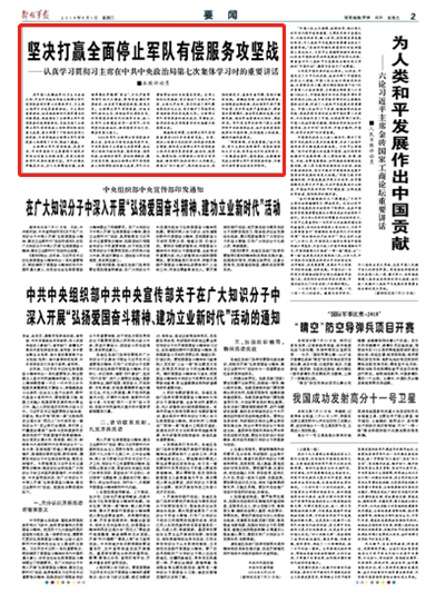 全面停止军队有偿服务,对纯正部队政治生态、保持我军性质和本色,对实现党在新时代的强军目标、把人民军队全面建成世界一流军队,对巩固党的执政地位、确保国家长治久安,都具有重大意义。请关注今日《解放军报》的报道——