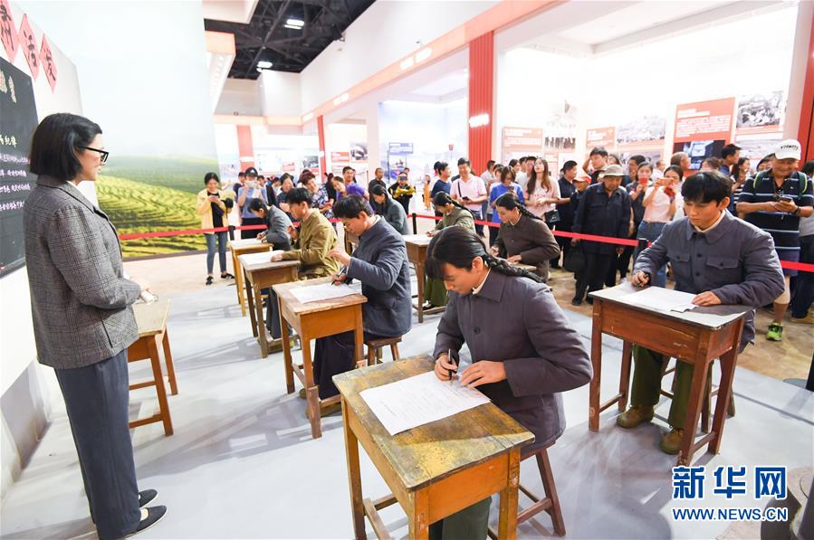 9月24日,观众在成就展上参观1977年高考的还原场景。 当日,“伟大历程 辉煌成就——庆祝中华人民共和国成立70周年大型成就展”开始向公众开放。 新华社记者陈晔华 摄