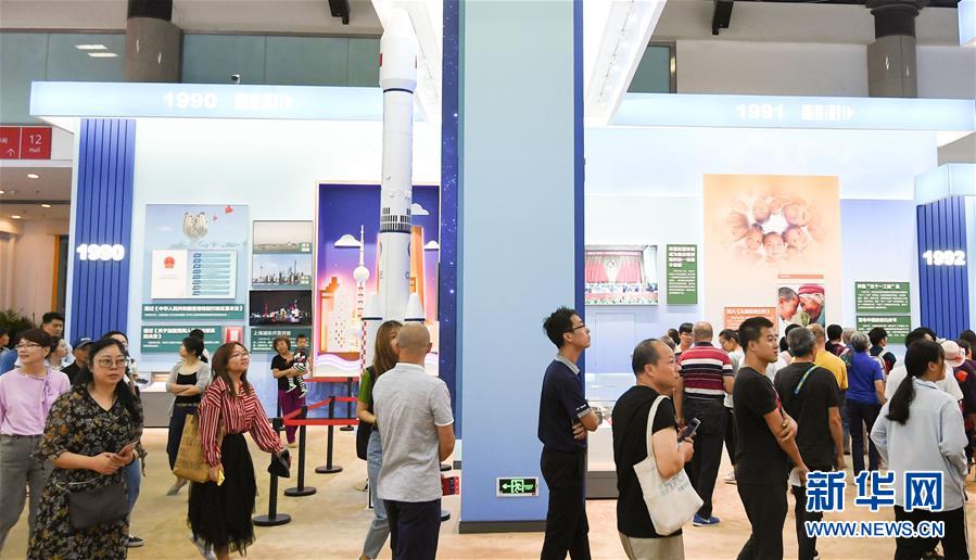 9月24日,观众在成就展上参观。 当日,“伟大历程 辉煌成就——庆祝中华人民共和国成立70周年大型成就展”开始向公众开放。 新华社记者陈晔华 摄