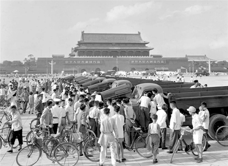 第一汽车制造厂制造出来的第一批38辆“解放牌”汽车,在1956年8月21日运到北京。这批汽车参加当年首都国庆节的检阅和游行。这是“解放牌”汽车停留在天安门广场上,人们纷纷赶来参观。(资料图片)