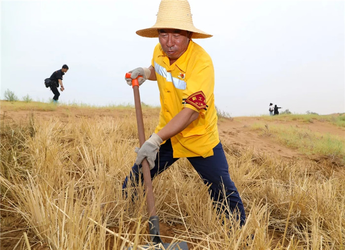用铁锹把干草深扎到沙粒中