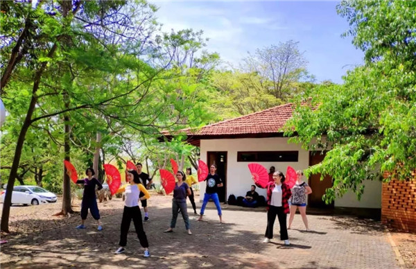 ▲巴西学生在巴西利亚大学孔子学院体验中国扇子舞。(巴西利亚大学孔子学院供图)