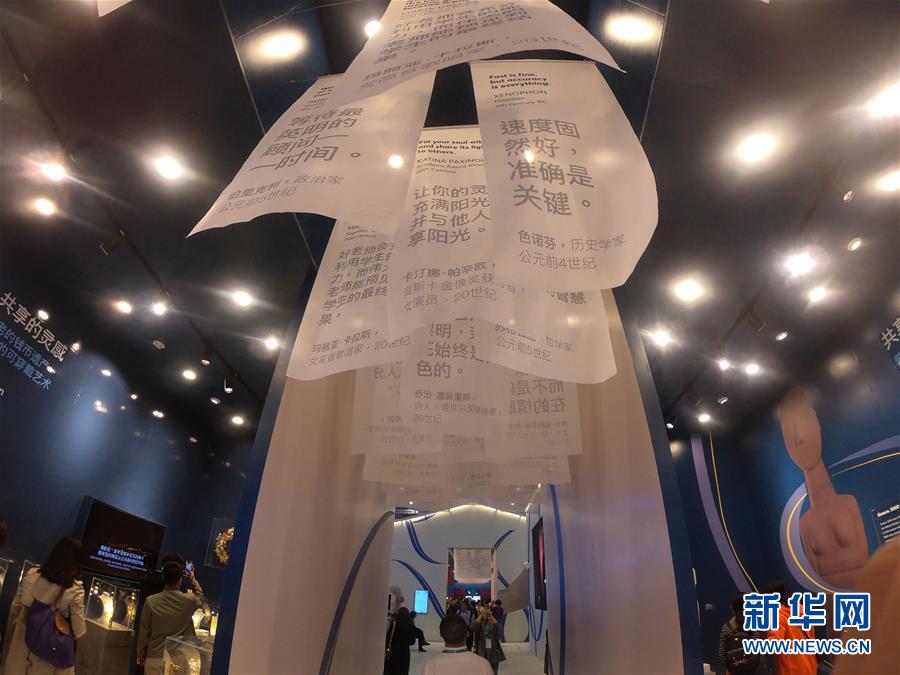 这是11月6日在第二届进博会拍摄的希腊展品。 爱琴海岸,古希腊文明跨越千年,成为孕育欧洲文明的摇篮。而在亚欧大陆的另一端,中华文明绵延传承,成为东方文明的杰出代表。同为文明古国,中希友好交往源远流长,两国民众有着天然的亲近感。在正在上海举行的第二届中国国际进口博览会上,希腊作为主宾国参展,展示了其文化、旅游、航运、食品等领域的产品。 新华社记者 鱼澜 摄