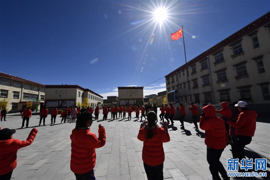 3月14日,学生们在课间跳锅庄舞。新华社记者 觉果 摄