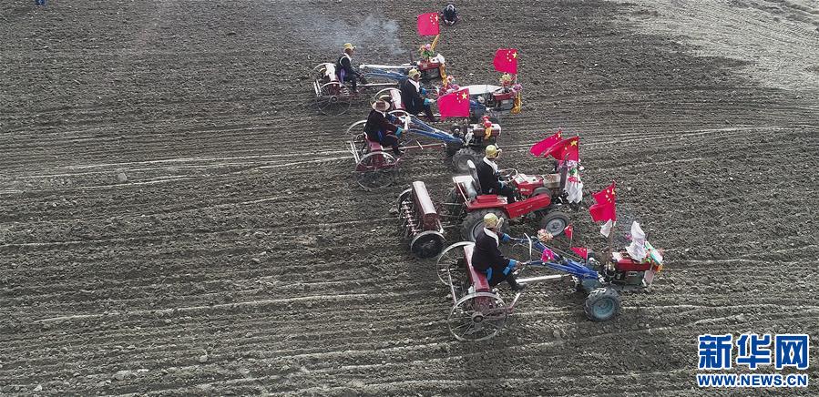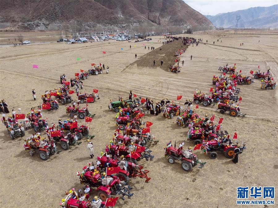 3月16日在拉萨市达孜区唐嘎乡拍摄的开耕仪式现场(无人机拍摄)。新华社发(孙非 摄)