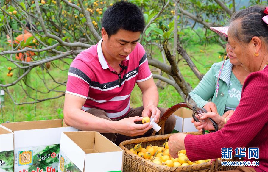 沙洲村村民朱利志(左)在果园将采摘的水果装箱(4月26日摄)。新华社记者 范军威 摄