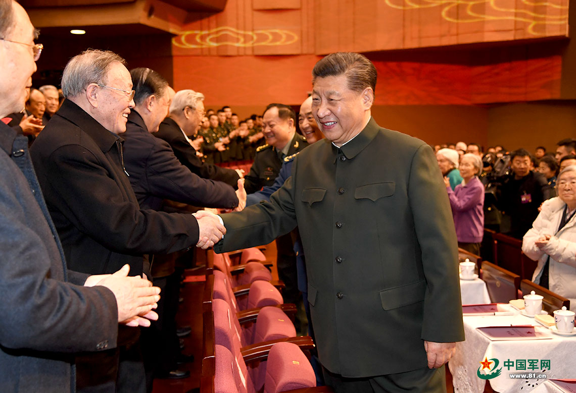 下午4时许,习近平来到老同志中间,全场响起热烈掌声。习近平同大家亲切握手,关切询问他们的身体和生活情况,共同回顾过去一年党、国家、军队事业取得的重大成就。老同志们一致表示,要更加紧密地团结在以习近平同志为核心的党中央周围,以习近平新时代中国特色社会主义思想为指导,贯彻习近平强军思想,贯彻新时代军事战略方针,坚持政治建军、改革强军、科技强军、人才强军、依法治军,不忘初心、牢记使命,锐意进取、开拓创新,为实现国防和军队建设2020年目标任务,为夺取全面建成小康社会伟大胜利作出新的贡献。