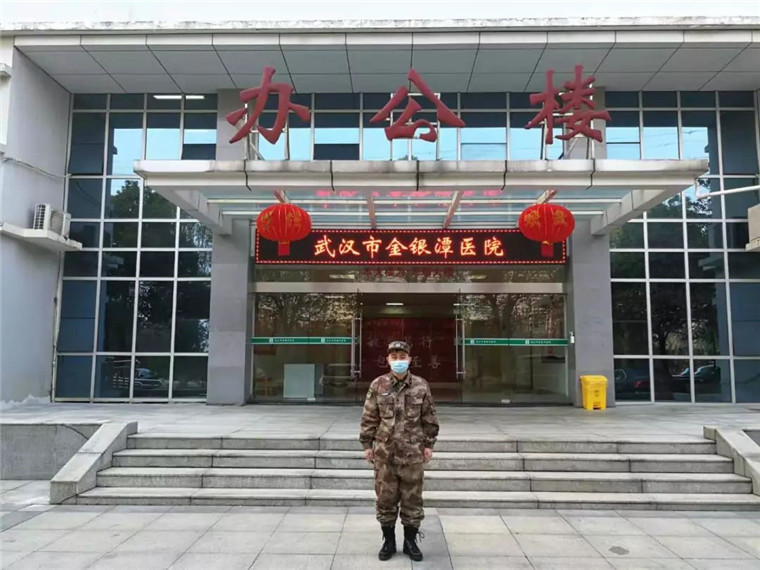 李传伟在金银潭医院办公楼前。