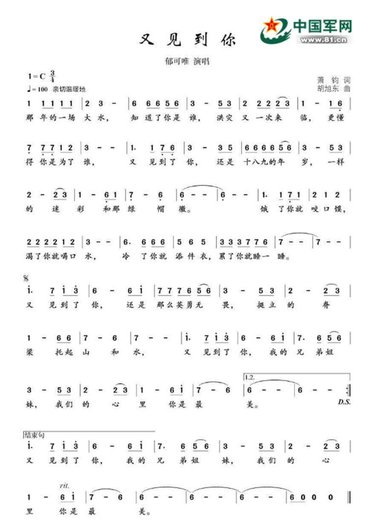 “那年的一场大水,知道了你是谁,洪灾又一次来临,更懂得你是为了谁……”军令如山,誓言铮铮,一首《又见到你》,将满腔赤诚化为对人民子弟兵的深情礼赞。