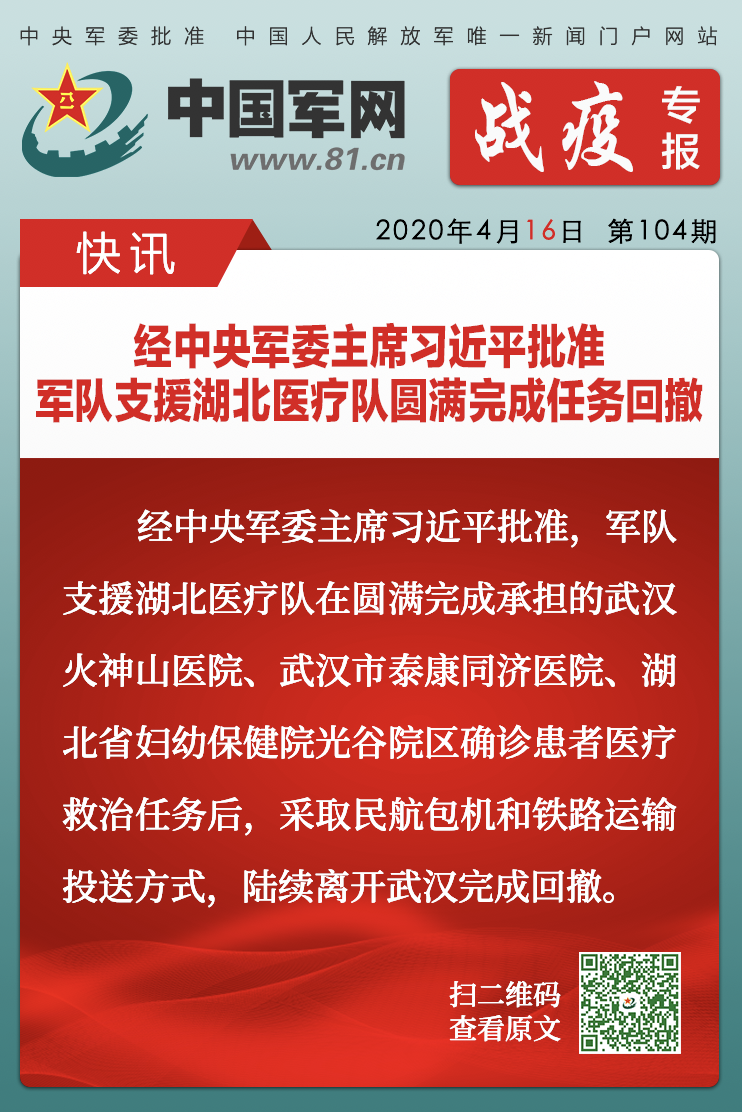 中国军网战疫专报|经中央军委主席习近平批准 军队支援湖北医疗队圆满完成任务回撤