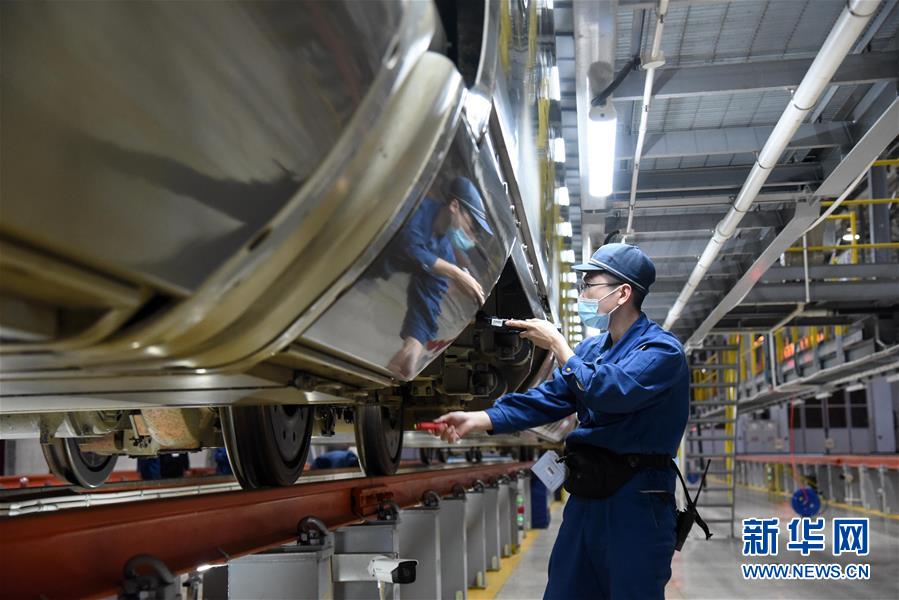 4月21日,中国铁路济南局集团公司青岛动车段临沂北动车所的工作人员在检查日兰高铁列车。新华社记者 王凯 摄