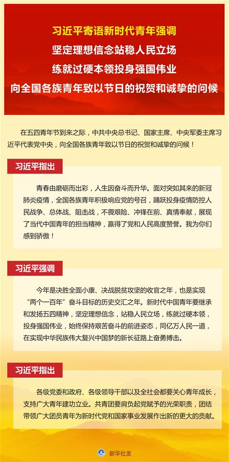 习近平强调,今年是决胜全面小康、决战脱贫攻坚的收官之年,也是实现“两个一百年”奋斗目标的历史交汇之年。新时代中国青年要继承和发扬五四精神,坚定理想信念,站稳人民立场,练就过硬本领,投身强国伟业,始终保持艰苦奋斗的前进姿态,同亿万人民一道,在实现中华民族伟大复兴中国梦的新长征路上奋勇搏击。