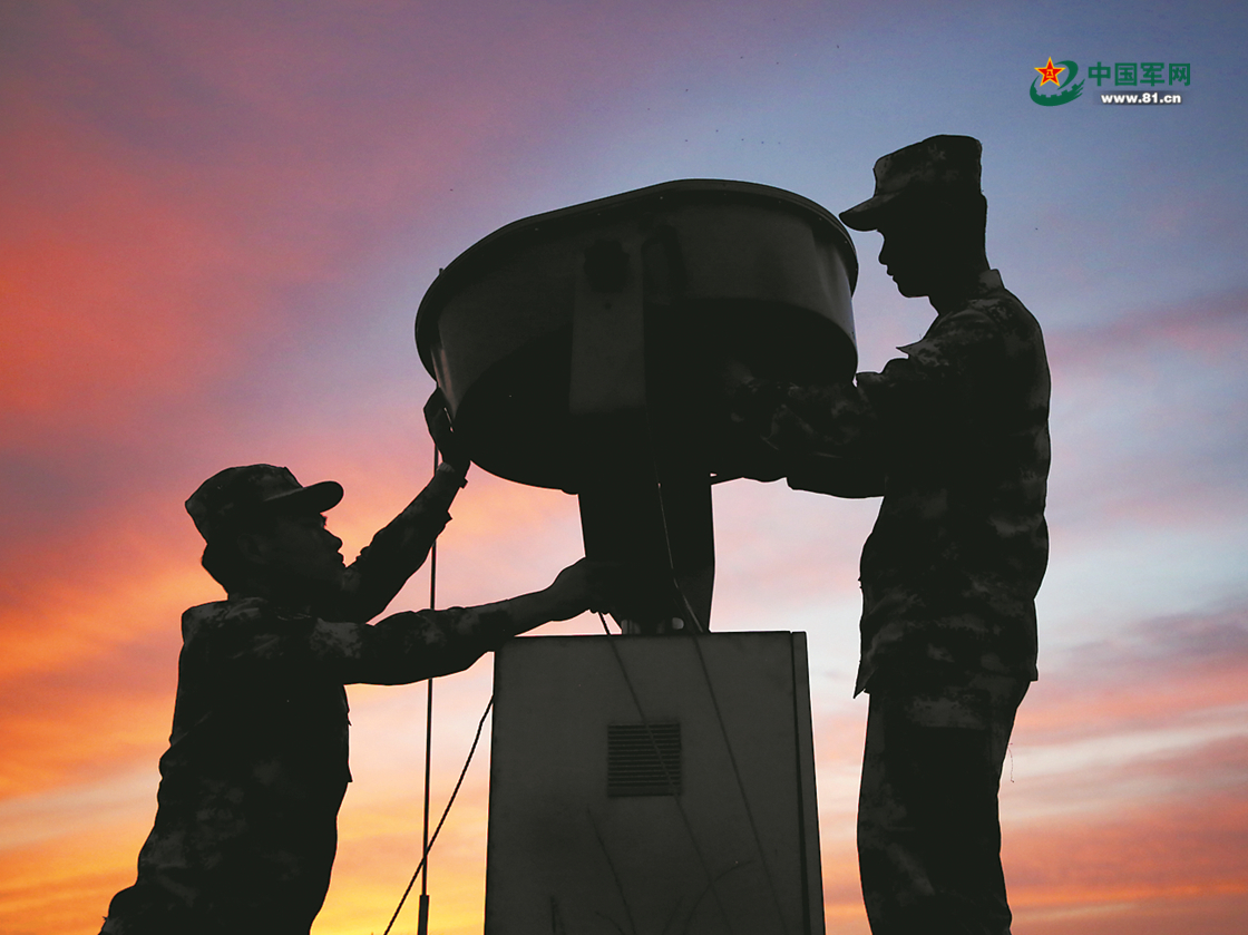 日暮时分,队员调试机场声波雷达,保障跨昼夜飞行训练。
