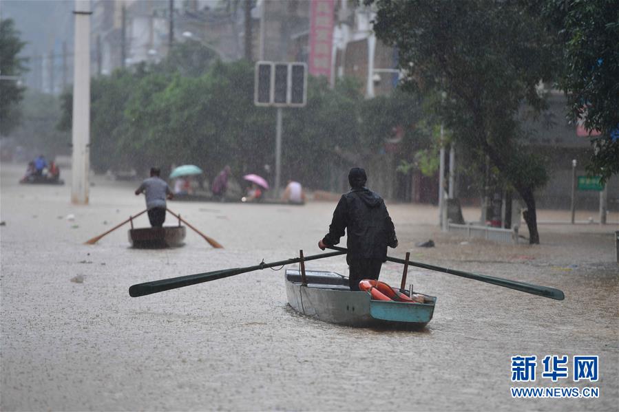 7月11日,在广西融水苗族自治县县城,居民在洪水中转移。新华社记者 黄孝邦 摄