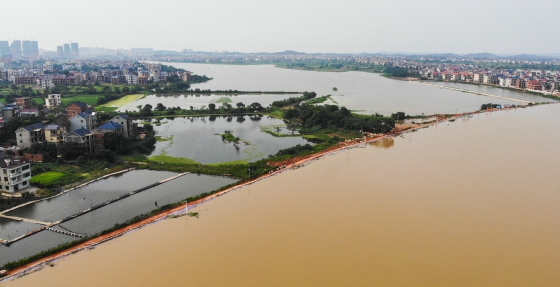 这是正在加固的昌江圩。堤坝的右边是不断逼近坝顶的昌江,左边是鄱阳县县城(7月13日摄 无人机照片)。新华社记者 胡晨欢 摄