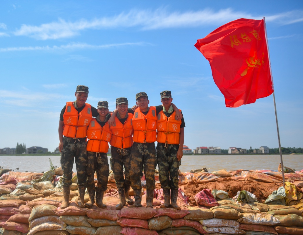 7月13日,武警江西总队机动支队防化中队的5名“00后“战士刘意飞、 麻排山、杨泽宇、袁龙、朱仁鹏(从左至右)在加固的圩堤上留影。新华社记者 胡晨欢 摄