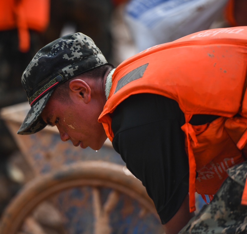 7月13日,武警江西总队机动支队防化中队战士麻排山(中)在战友的协助下,将沙袋扛在肩上。新华社记者 胡晨欢 摄