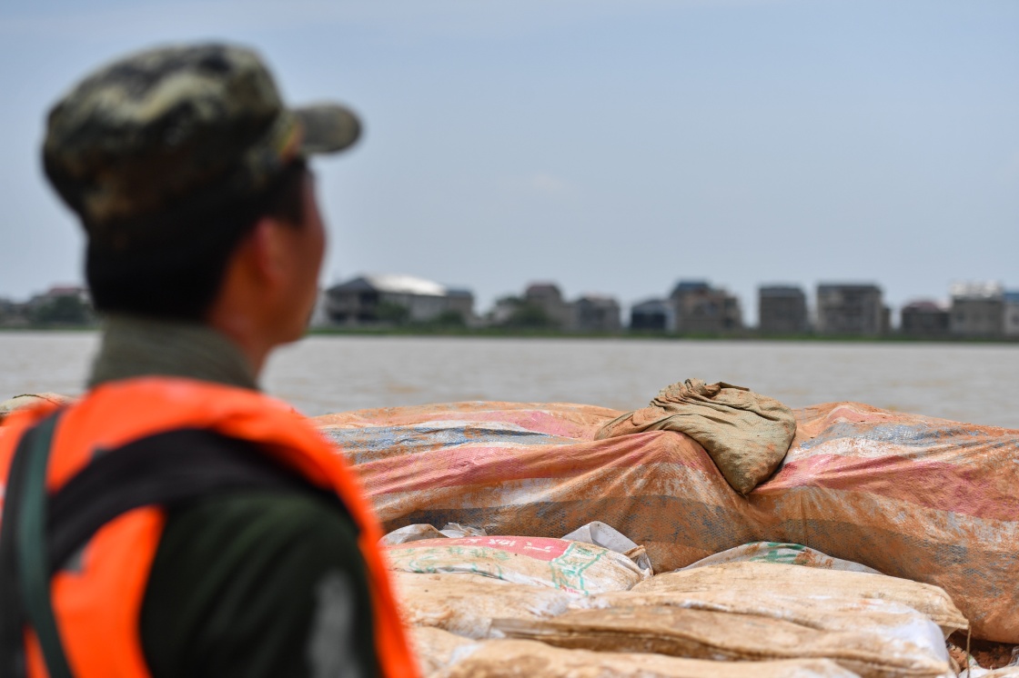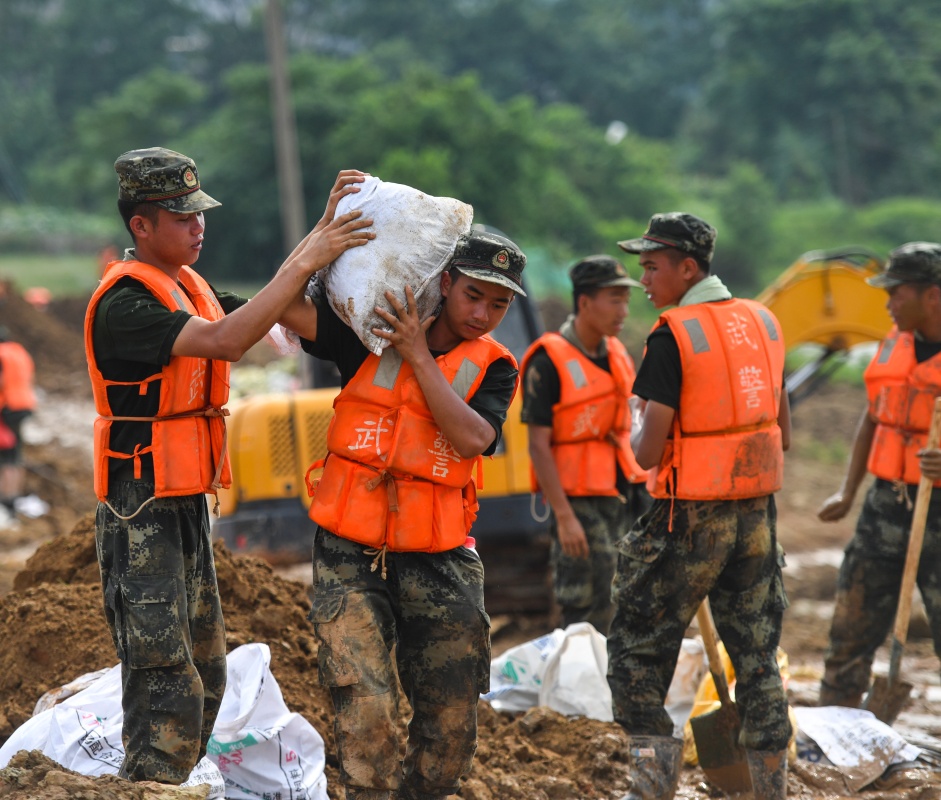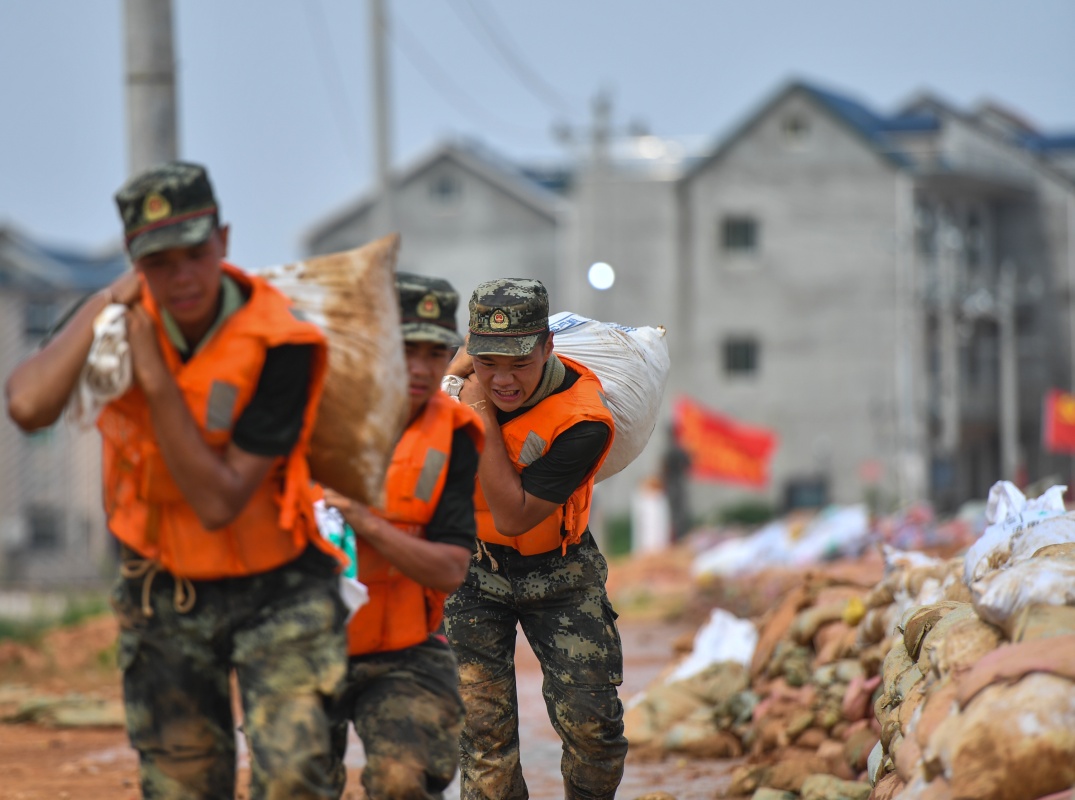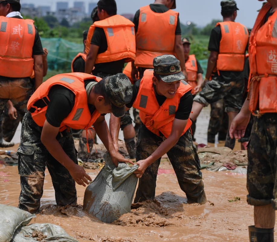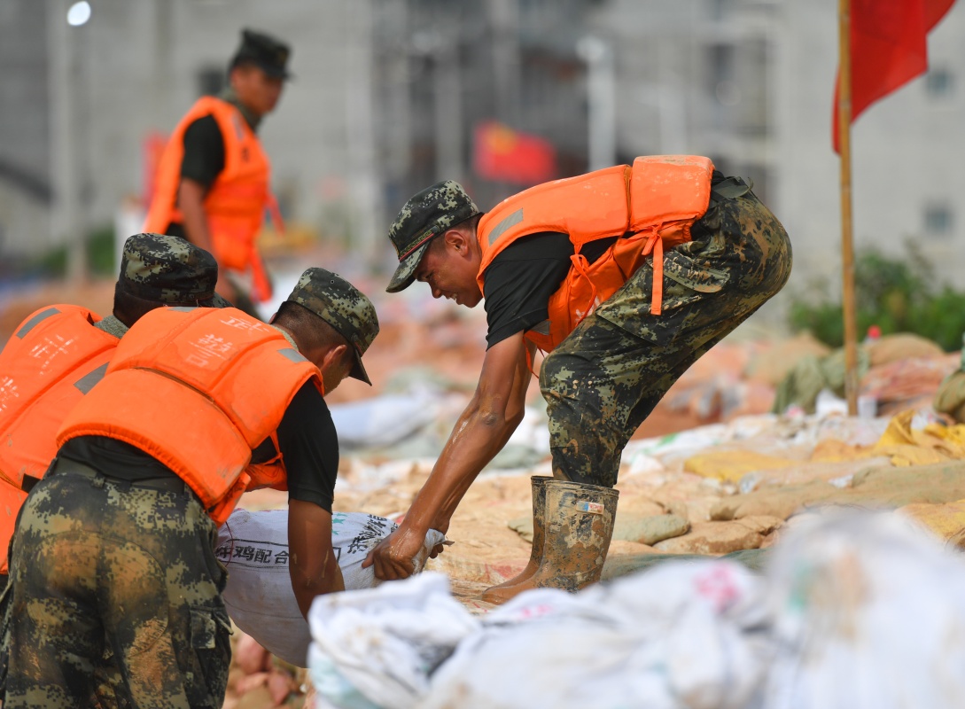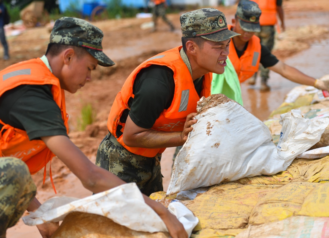 7月13日,武警江西总队机动支队防化中队战士朱仁鹏(右一)和战友一起用沙袋加固圩堤。新华社记者 胡晨欢 摄