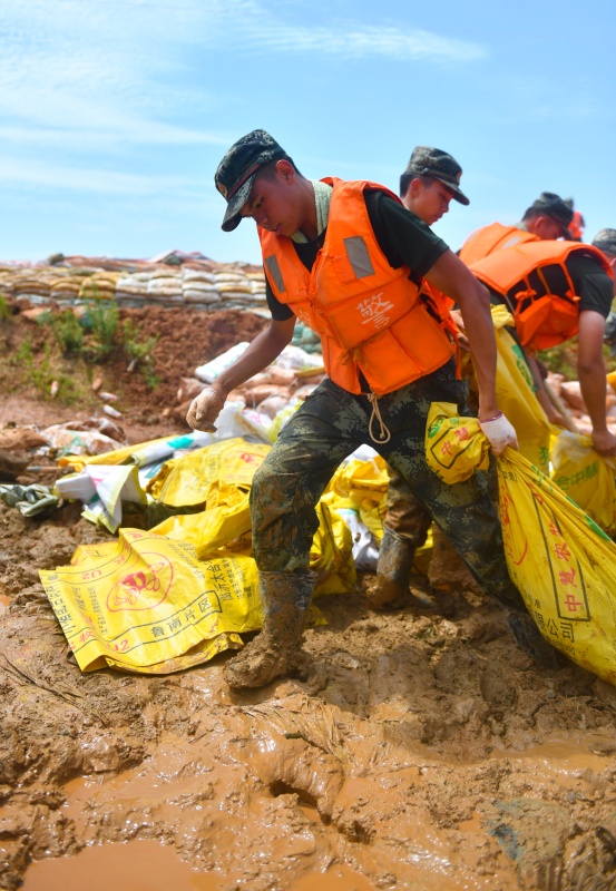 7月13日,武警江西总队机动支队防化中队战士刘意飞(中)用沙袋加固圩堤。新华社记者 胡晨欢 摄