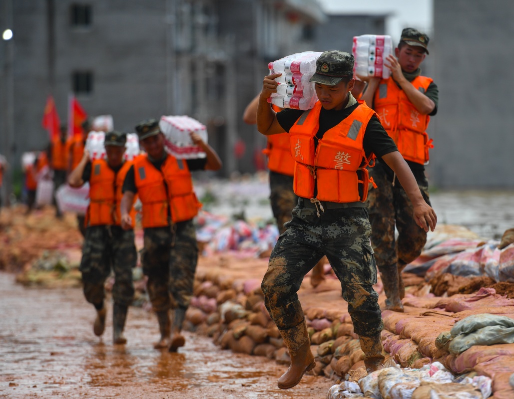 7月13日,武警江西总队机动支队防化中队战士刘意飞(前)和战友们为大家运送矿泉水(7月13日摄)。新华社记者 胡晨欢 摄