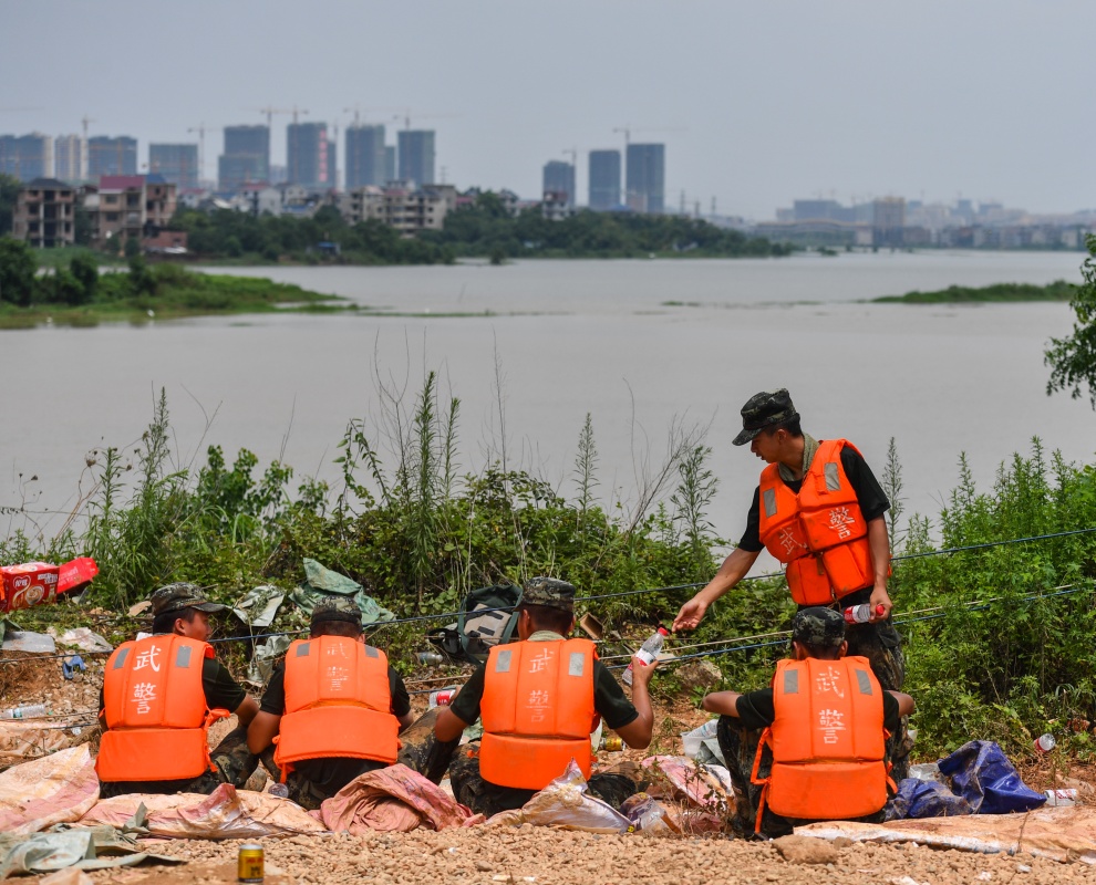 随着防汛压力的不断增大,在位于鄱阳县城附近的昌江圩堤上,江水正逐渐逼近堤坝坝顶。堤坝之上,武警江西总队机动支队的战士,沿堤坝垒起高1.5米、长1500米的“土龙”,将洪水死死拦截在外……