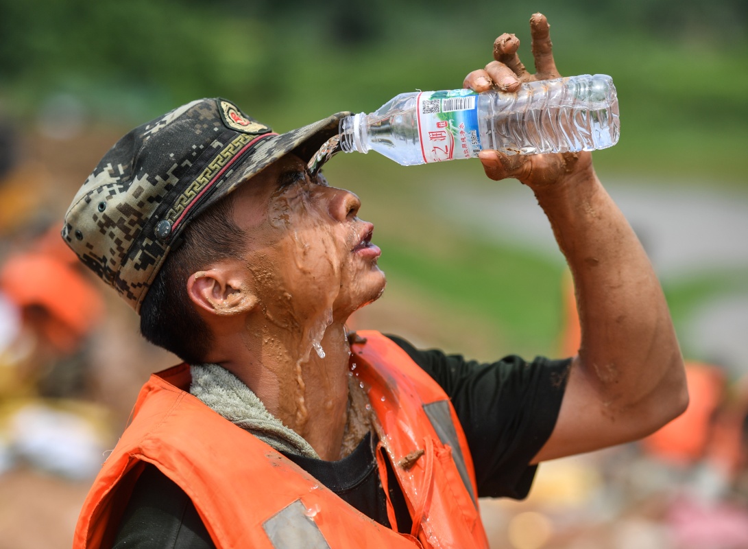 7月13日,武警江西总队机动支队防化中队战士麻排山用水冲去脸上的泥沙。新华社记者 胡晨欢 摄
