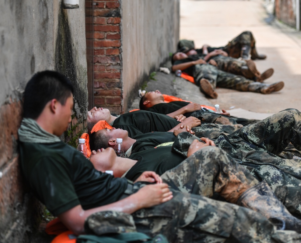 7月13日,武警江西总队机动支队防化中队的5名“00后”战士(前)在圩堤附近的驻地江家岭村休息。为了减少对当地居民的干扰,战士们都睡在村里的民房外。新华社记者 胡晨欢 摄