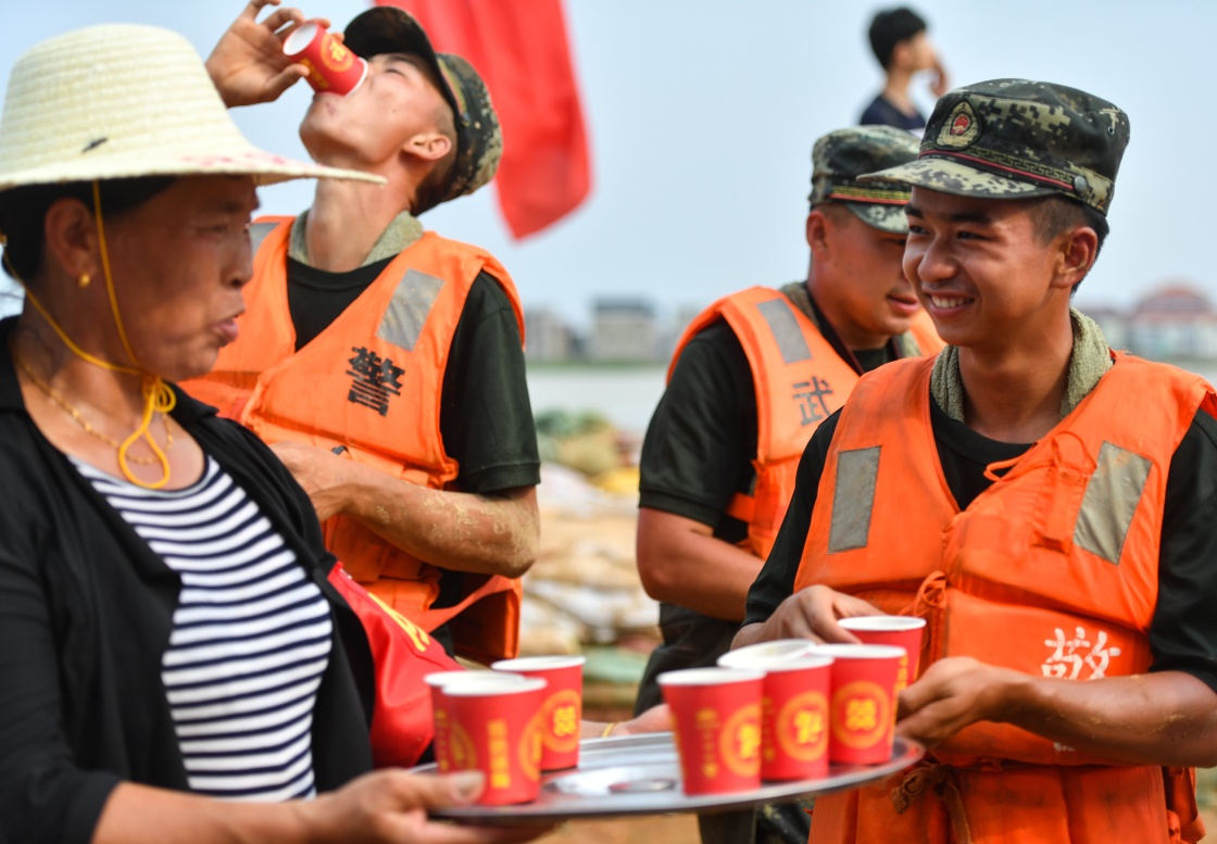 7月13日,江家岭村的百姓给武警江西总队机动支队防化中队的麻排山(右一)和战友们送来自制的绿豆汤。新华社记者 胡晨欢 摄